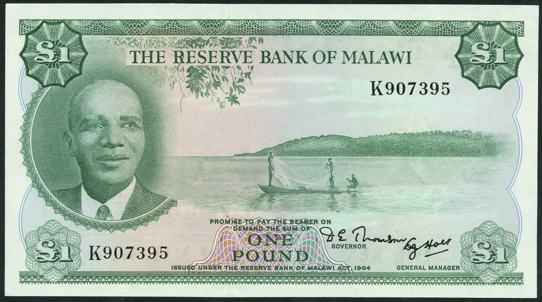 (x) Reserve Bank of Malawi, 5 shillings, serial number F 098087, blue-grey, 10 shillings, serial number G 669363, red-brown, also £1, serial number K 907395, all 1968-1971, President Hastings Banda at left, fishermen on Lake Malawi at centre, D.E.Thomson and D.J.Holt signatures