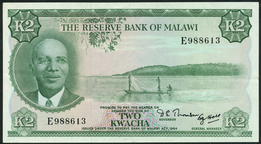 (x) Reserve Bank of Malawi, 50 tambala, serial number D 490445, blue-grey, 1 kwacha, serial number D 051646, red-brown, also 2 kwacha, serial number E 988613; all 1968-1971, all President Hastings Banda at left, fishermen on Lake Malawi at centre, D.E.Thomson and D.J.Holt signatures