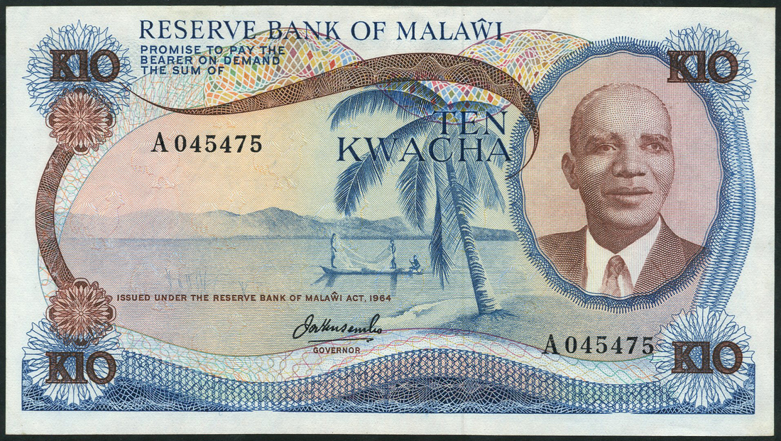 (x) Reserve Bank of Malawi, 50 tambala, serial number D 452935, blue-grey, 1 kwacha, serial number A 071560, red-brown, also 5 kwacha, serial number B 247839, red and 10 kwacha, serial number A 045475, blue and purple-brown, all 1973, all President Hastings Banda at left, fishermen on Lake Malawi at centre, John Zenus Ungapake Tembo signature
