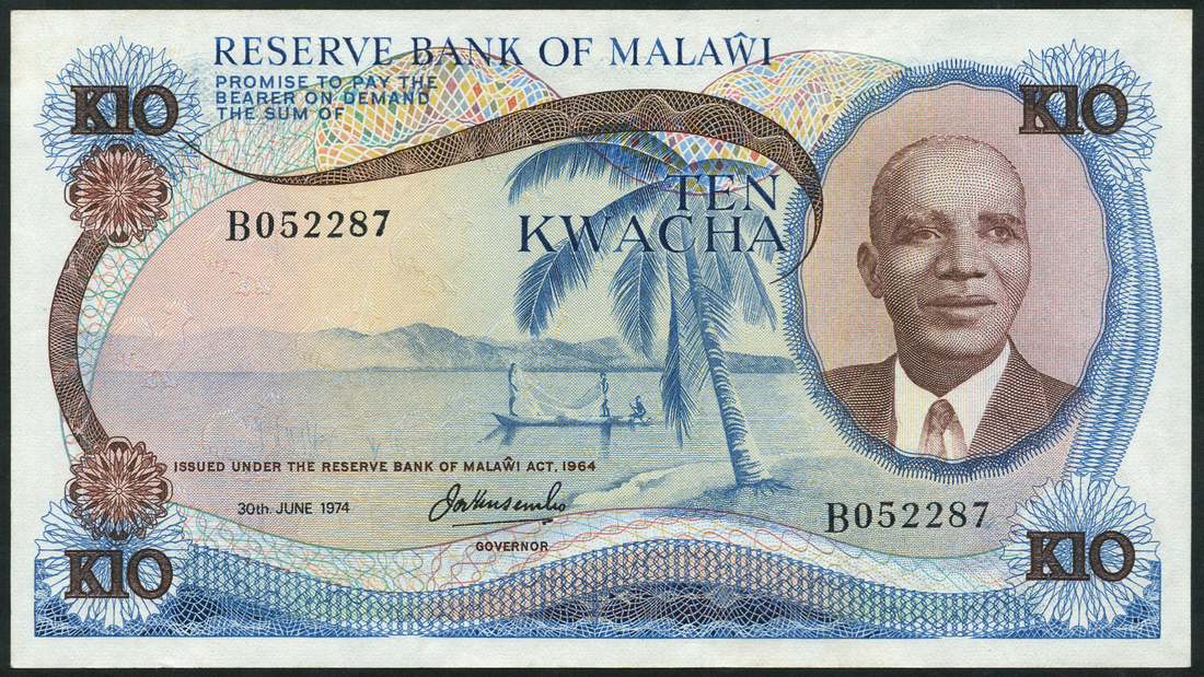 (x) Reserve Bank of Malawi, 50 tambala, serial number E 663588, blue-grey, 1 kwacha, serial number G 417005, red-brown and 10 kwacha, serial number B 052287, blue and purple-brown, all dated 30 June 1974, all President Hastings Banda at left, fishermen on Lake Malawi at centre, John Zenus Ungapake Tembo signature