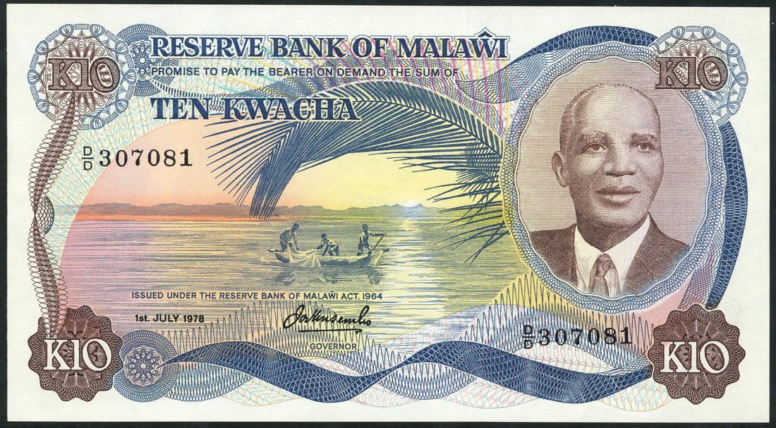 (x) Reserve Bank of Malawi, 50 tambala, serial number R/R 585446, blue-grey, 1 kwacha, serial number AA/A 095384, red-brown, also 5 kwacha, serial number D/D 726196, red, and 10 kwacha, serial number D/D 307081, blue and purple-brown, all 1 July 1978, all President Hastings Banda at left, fishermen on Lake Malawi at centre, all John Zenus Ungapake Tembo signature