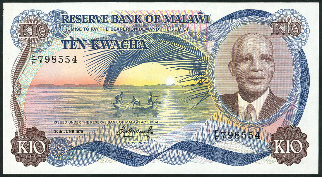 (x) Reserve Bank of Malawi, 50 tambala, serial number Y/Y 014878, 1 January 1981, blue-grey, 1 kwacha, serial number AE/A 130499, red-brown, also 5 kwacha, serial number G/G 334165, red, and 10 kwacha, serial number F/F 798554, blue and purple-brown, all 30 June 1979, all President Hastings Banda at left, fishermen on Lake Malawi at centre, all John Zenus Ungapake Tembo signature