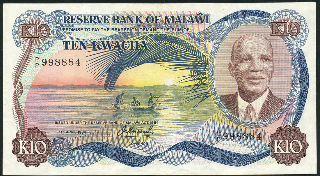 (x) Reserve Bank of Malawi, 50 tambala, serial number A/20 366612, 1 November 1984, blue-grey, 1 kwacha, 1 January 1983, serial number BN/A 908875, red-brown, also 5 kwacha, 1 November 1984, serial number C/11 081551, red, and 10 kwacha, serial number P/P 998884, blue and purple-brown, 1 April 1984, all President Hastings Banda at left, fishermen on Lake Malawi at centre, all John Zenus Ungapake Tembo signature