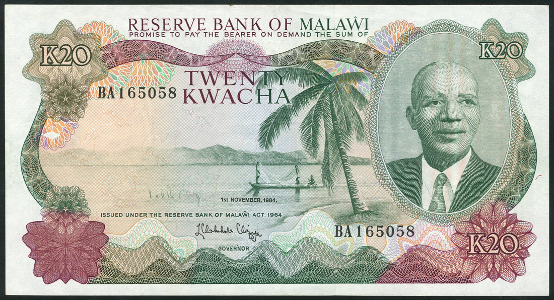 (x) Reserve Bank of Malawi, 1 kwacha (2),1 April 1984, 1 November 1984, prefixes CY/A and B/21, also 10 kwacha (2), 1 November 1984 and 1 August 1985, prefixes D/14 and D/17, blue and purple-brown, also 20 kwacha, 1 November 1984, serial number BA 165058, green and red-brown, doctor Hastings Banda at right, fishermen on Lake Malawi at centre, first note John Zenus Ungapake Tembo signature, balance signature