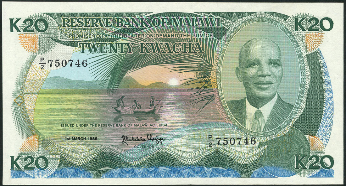 (x) Reserve Bank of Malawi, 50 tambala, 1 March 1986, prefix F/1, blue-grey, 1 kwacha, 1 March 1986, prefix G/1, red-brown, also 5 kwacha, 1 March 1986, prefix J/10, red, and 10 kwacha, 1 March 1986, prefix M/3, blue and purple-brown, also 20 kwacha, 1 March 1986, prefix P/2, blue-green and multicoloured, all President Hastings Banda at left, fishermen on Lake Malawi at centre, the 1986 all signature of Chaziya