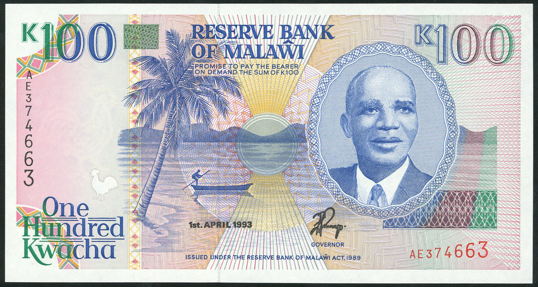 (x) Reserve Bank of Malawi, 5 kwacha, 1994, prefix BG, red, 10 kwacha (2), 1992,1994, prefixes BX and BD, blue, 20 kwacha, 1993, prefix AW, green and 50 kwacha, 1994, prefix AP, violet, also 100 kwacha (2), 1993 and 1994, prefixes AE and AP, blue, all Doctor Hastings Banda at right, fisherman on lake Malawi at centre, signature of Pelekamoyo