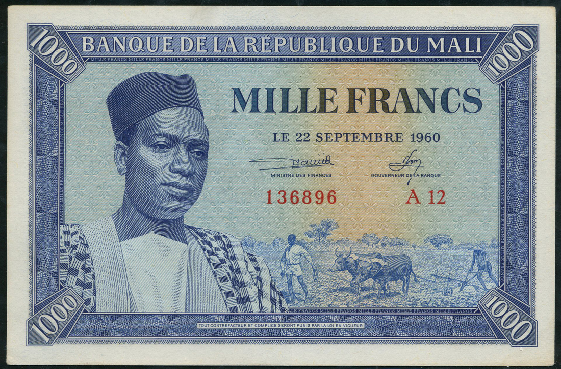 (x) Banque de la Republique du Mali, 1000 Francs, serial number A12 136896, blue and pale orange, President Modibo Ke’ita at left, signatures of Maiga and Sow, reverse blue, man and huts, value at each corner