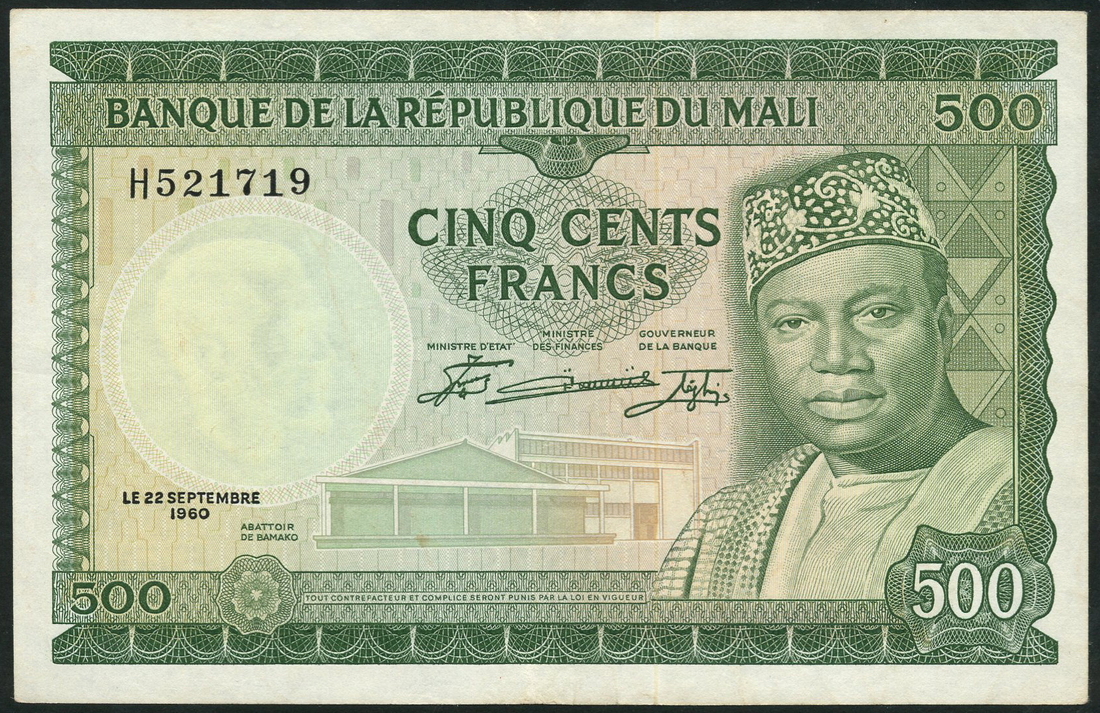 (x) Banque de la Republique du Mali, 50 Francs, prefix B, purple and multicoloured, Keita at right, reverse woman and village; 100 Francs, prefix C, brown and multicoloured, Keita at right, reverse man and boats, 500 francs, prefix H, green, Keita at right, all dated 22 September 1960 and signatures of Maiga, Kone and Cisse