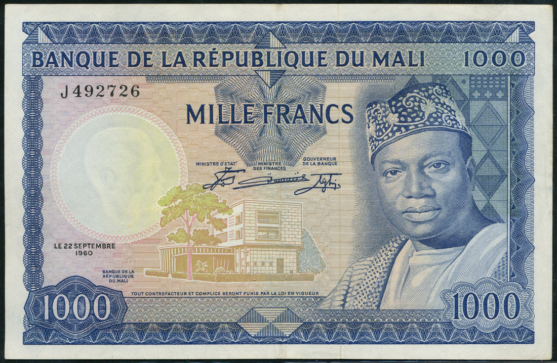 (x) Banque de la Republique du Mali, 1000 Francs, 22 September 1960, serial number J 492726, blue and multicoloured, Modibo Keita at right, bank building low centre, signatures of Maiga, Kone and Cisse at centre, reverse the Great Mosque in Djenne, value at left and right