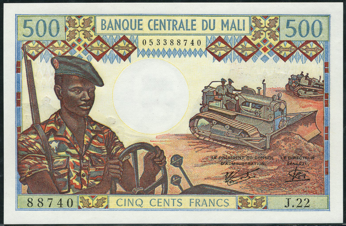 (x) Banque Centrale du Mali, 100 Francs, ND, (1972), prefix H13, pale blue and multicoloured, Tuareg woman at left, Hotel de l'Amitie in Bamako at right, Dussine and Sangarre signatures, reverse woman and boats on the Niger river, also 500 Francs, ND 1973-84, multicoloured, soldier at left, bulldozers at right, signatures of Miege and Kanoute, reverse Bedouin and camels