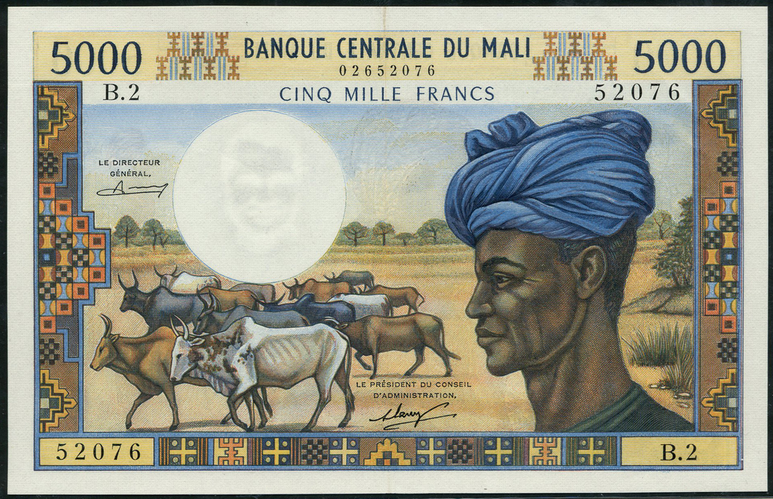 (x) Banque Centrale du Mali, 5000 Francs, ND (1972), serial number B2 52076, blue, brown and multicoloured, Fulani man with electric blue turban at right, cattle at left, signatures of Dussine and Sangare, reverse multicoloured, Boughani women picking cotton, loom at right