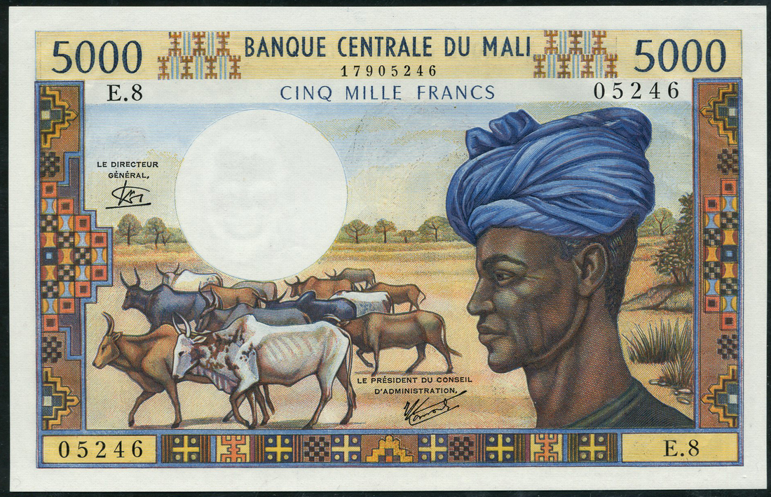 (x) Banque Centrale du Mali, 5000 Francs, ND (1972), serial number E8 05246, blue, brown and multicoloured, Fulani man with electric blue turban at right, cattle at left, signatures of Miege and Kanoute, reverse multicoloured, Boughani women picking cotton, loom at right