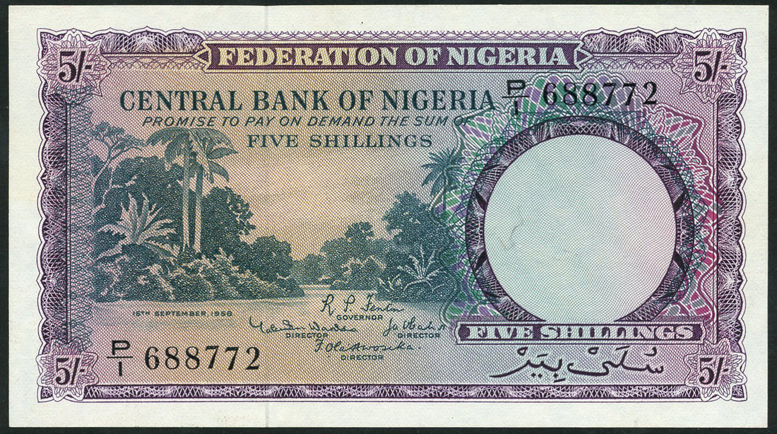 (x) Central Bank of Nigeria, 5 shillings, 15 September 1958, serial number P/1 688772, purple and green, the Niger River left centre, value at each corner, signatures of Fenton, Wanka, Awosika and Obahor, reverse purple, palm trees