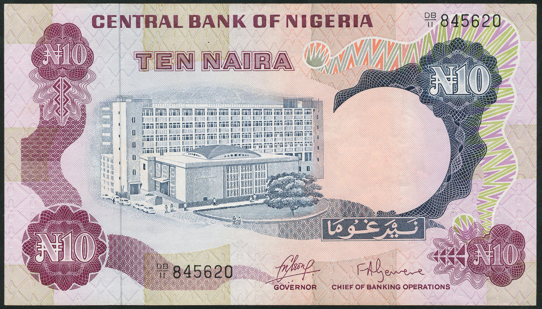 (x) Central Bank of Nigeria, 10 Naira (4), ND (1973-78), signatures 1-4, purple and blue, all Central Bank building at left, reverse Kainji dam