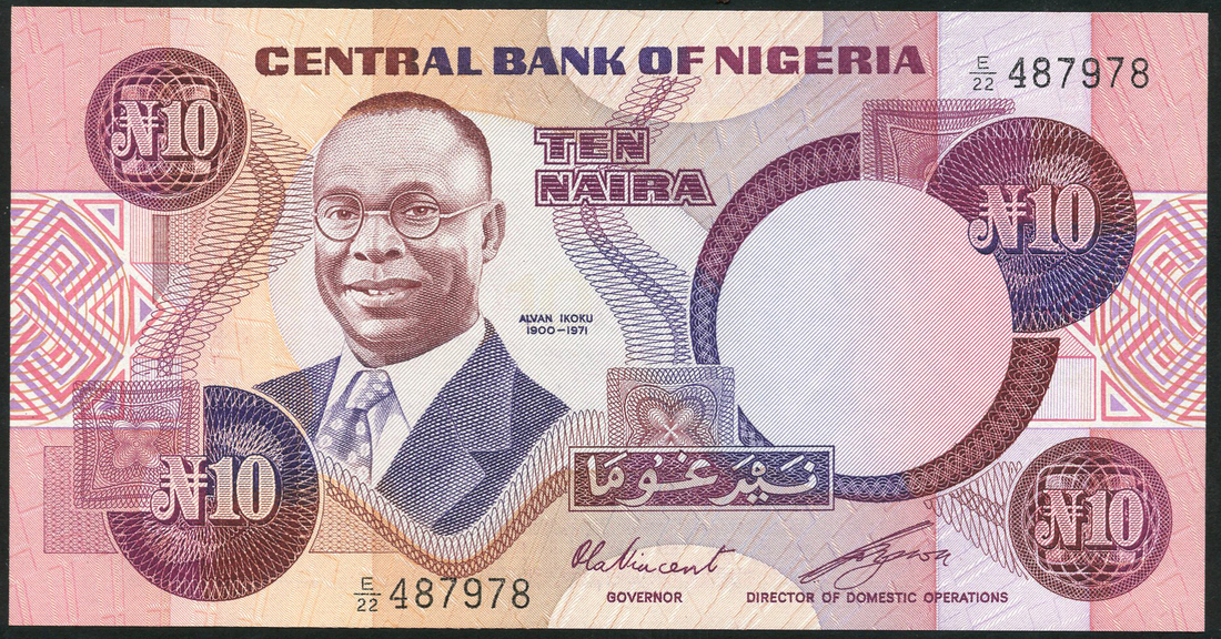 (x) Central Bank of Nigeria, a group comprising, 1 Naira (3), ND (1979), signatures 4-6, red, all Herbert Macaulay at left, reverse mask; 5 Naira (2), ND 1979, signatures 4 and 5, green, both Balewa at left, reverse dancers; 10 Naira (3), signatures 4-6, brown and purple, all Alvan Ikoku at left, reverse two women with bowls