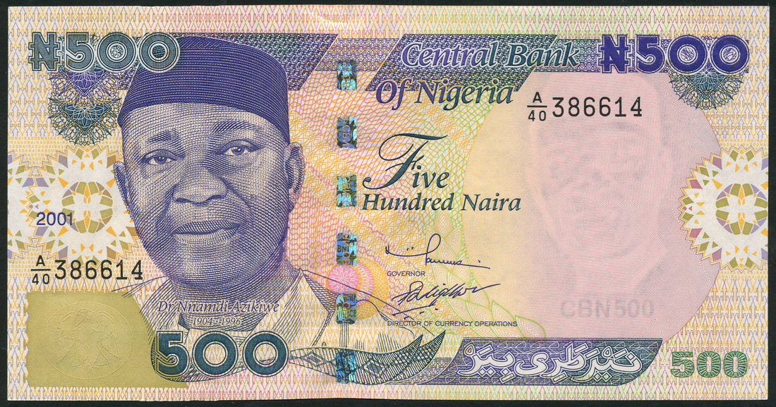 (x) Central Bank of Nigeria, a group of the ND (1984-2001) Issues comprising 1 Naira (3), signatures 6, 7 and 9, red, black and green, all Macaulay at left; 5 Naira (6), signatures 6-11, purple and pink, all Balewa at left; 10 Naira (6), signatures 6-11, red and orange, all Ikoku at left; 20 Naira (6), signatures 6-11, green and blue, General Muhammed at left; 50 Naira (4), signatures 8-11, blue, four citizens at left; 100 Naira (2), 1999, 2001, Awolowo at left; 200 Naira, 2000, Bello at left, and 500 Naira, 2001, Azikiwe at left