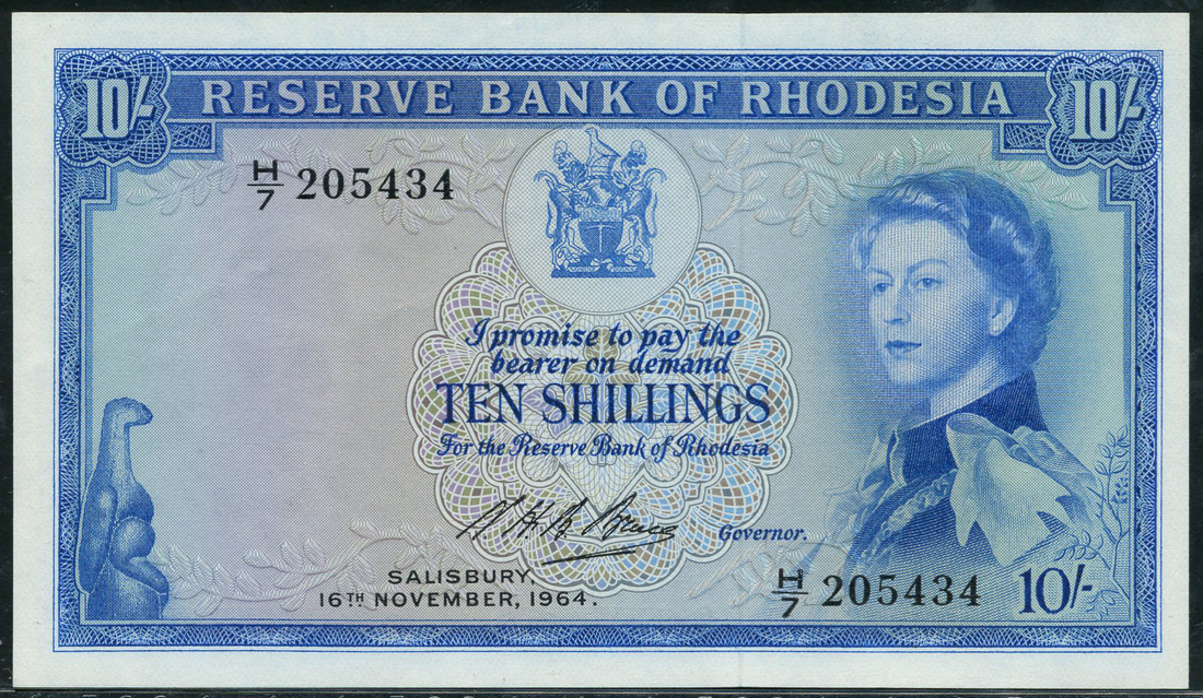 (x) Reserve Bank of Rhodesia, 10 shillings, 16 November 1964, serial number H/7 205434, blue and lilac and brown, Elizabeth II at right, arms top centre, stone falcon at left, Noel Bruce signature low centre, reverse blue, tobacco field