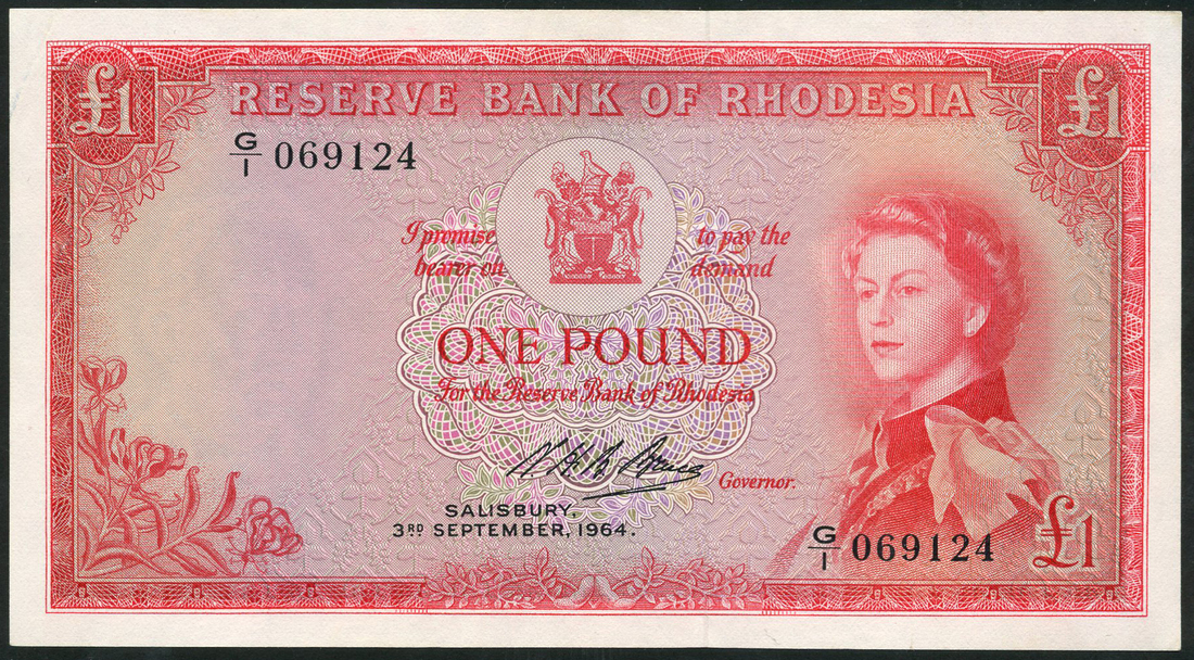 (x) Reserve Bank of Rhodesia, £1, 3 September 1964, serial number G/1 069124, red and pink and green, Elizabeth II at right, arms top centre, flowers low left, signature of Noel Bruce low centre, reverse red and pale green, Victoria Falls at centre