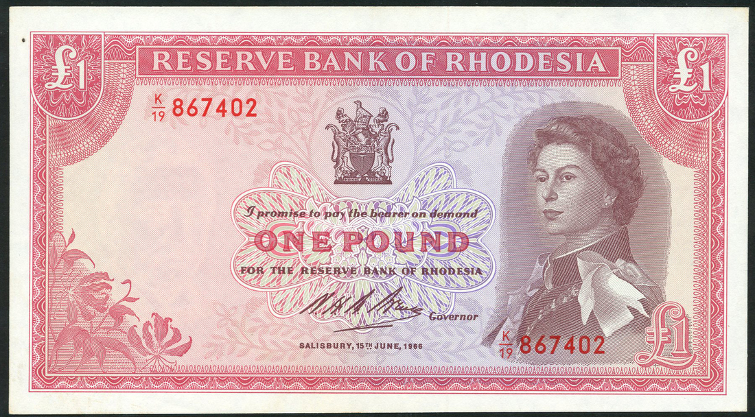 (x) Reserve Bank of Rhodesia, £1, 15 June 1966, red serial number K/19 867402, pink-red and green and lilac, Elizabeth II at right, arms top centre, flowers low left, Noel Bruce signature low centre, reverse pink-red and grey, Victoria Falls at centre
