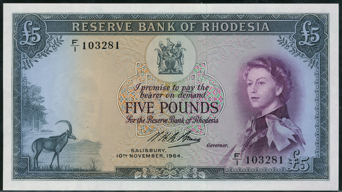 (x) Reserve Bank of Rhodesia, £5, 10 November 1964, serial number F/1 103281, blue-grey and multicoloured, Elizabeth II at right, arms top centre, Sable antelope at left, Noel Bruce signature low centre, reverse blue-grey, Great Zimbabwe ruins at centre