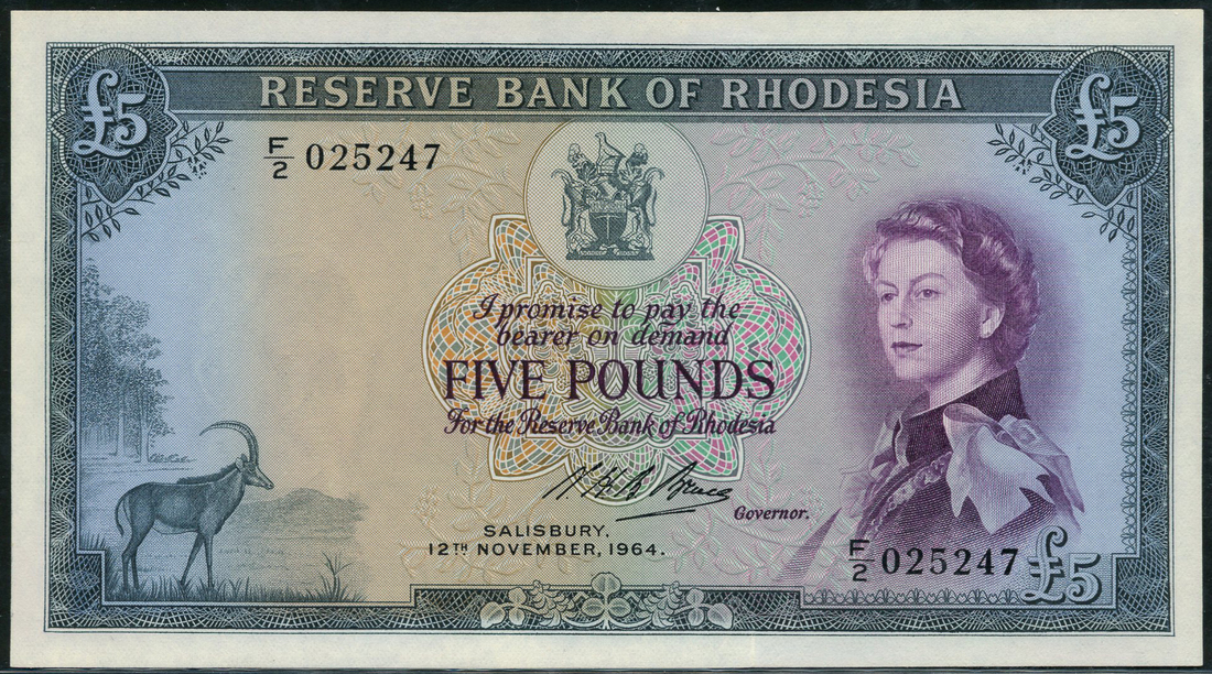 (x) Reserve Bank of Rhodesia, £5, 12 November 1964, serial number F/2 025247, blue-grey and multicoloured, Elizabeth II at right, arms top centre, Sable antelope at left, Noel Bruce signature low centre, reverse blue-grey, Great Zimbabwe ruins