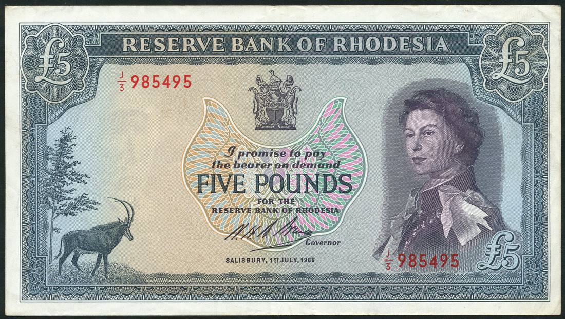 (x) Reserve Bank of Rhodesia, £5, 1 July 1966, serial number J/3 985495, blue-grey and multicoloured, Elizabeth II at right, arms top centre, Sable antelope at left, Noel Bruce signature low centre, reverse blue-grey and brown, Great Zimbabwe ruins