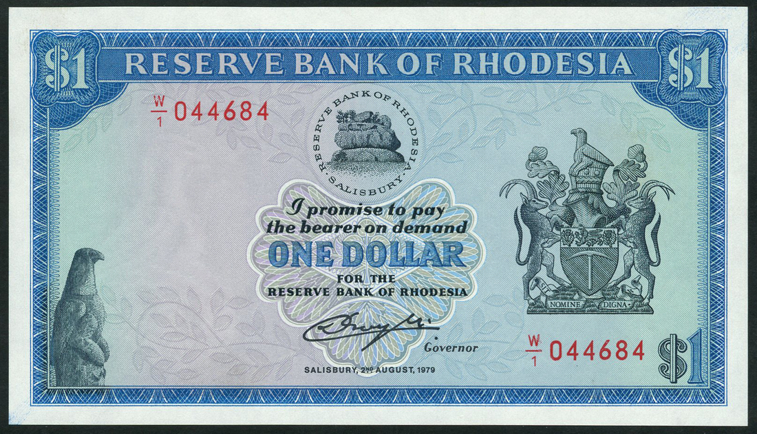 (x) Reserve Bank of Rhodesia, $1 (6), 1976,1978,1979, also replacements dated 1976,1978,1979, prefixes L/96,L/109,L/115, the replacements all prefix W/1, blue and lilac, arms at right, bank logo top centre, stone falcon low left, all Desmond Crough signature, reverse blue, tobacco field, all Rhodes watermark except the 1979 issue which has falcon watermark