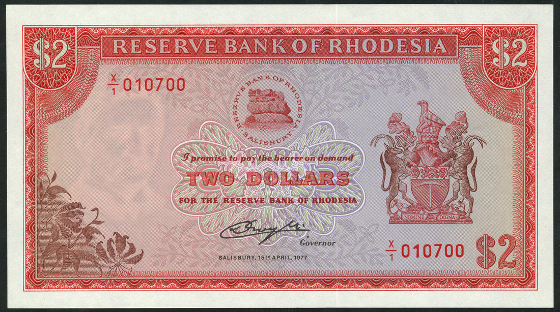 (x) Reserve Bank of Rhodesia, $2 (5), 1976,1977 (2), and replacement 1977 (2), prefixes K/123,K/132,K/144, the replacements X/1, red, pink, green and lilac, arms at right, bank logo top centre, stone falcon low left, all Desmond Crough signature, reverse red, Victoria Falls at centre
