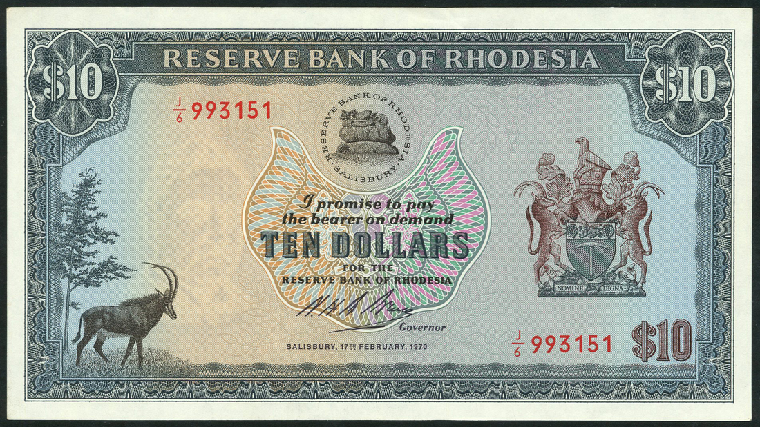 (x) Reserve Bank of Rhodesia, $10, 17 February 1970, serial number J/6 993151, blue-grey, pale pink and blue, arms at right, bank logo top centre, Sable antelope low left, Noel Chance signature, reverse blue-grey, Great Zimbabwe ruins at centre