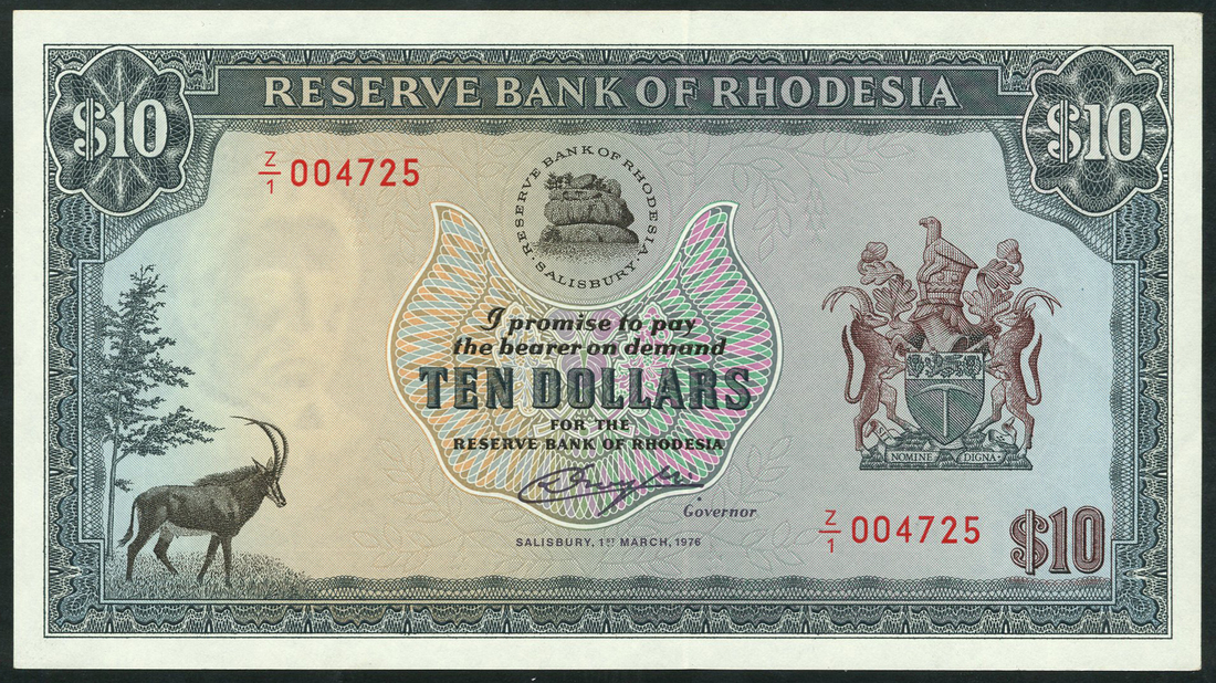 (x) Reserve Bank of Rhodesia, $10 (6), 19 November 1975, 3 December 1975, 1 March 1976 (2),2 January 1979, prefixes J/37,J/38,J/45,Z/1,J/52,Z/1, blue-grey, pale pink and blue, arms at right, bank logo top centre, Sable antelope low left, first two Noel Bruce signature, balance Desmond Crough signature, reverse blue-grey, Great Zimbabwe ruins at centre, one 1976 and one 1979 replacements, also a Reserve Bank $1,2007, and $2,1983