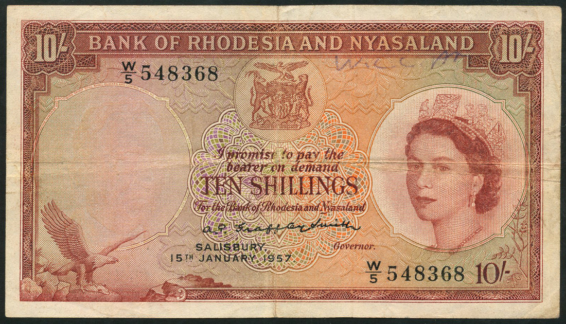 (x) Bank of Rhodesia and Nyasaland, 10 shillings, 15 January 1957, prefix W/5, red-brown and pale green and orange, Elizabeth II at right, arms top centre, Fish Eagle at left, Grafftey-Smith signature low centre, reverse red-brown and pale blue, river