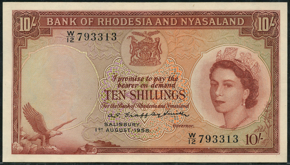(x) Bank of Rhodesia and Nyasaland, 10 shillings, 1 August 1958, serial number W/12 793313, red-brown and pale green and orange, Elizabeth II at right, arms top centre, Fish Eagle at left, Grafftey-Smith signature low centre, reverse red-brown and pale blue, river