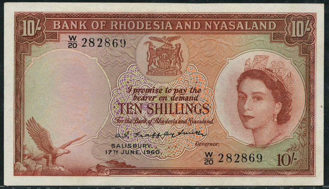 (x) Bank of Rhodesia and Nyasaland, 10 shillings, 17 June 1960, serial number W/20 282869, red-brown and pale green and orange, Elizabeth II at right, arms top centre, Fish Eagle at left, Grafftey-Smith signature low centre, reverse red-brown and pale blue, river