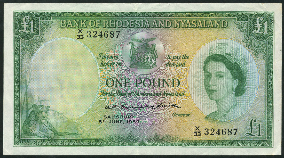 (x) Bank of Rhodesia and Nyasaland, £1, 5 June 1959, serial number X/33 324687, green and orange, Elizabeth II at right, arms top centre, leopard low left, Grafftey-Smith signature, reverse green and orange, the Great Zimbabwe ruins at centre