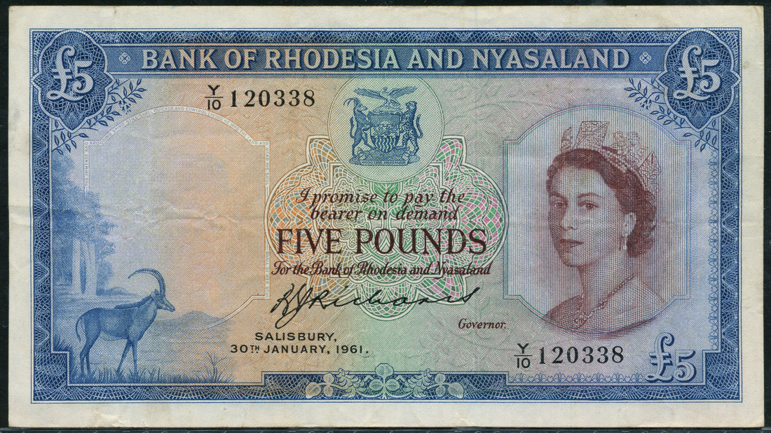 (x) Bank of Rhodesia and Nyasaland, £5, 30 January 1961, serial number Y/10 120338, blue and pale orange and green, Elizabeth II at right, arms top centre, Sable antelope at left, Richards signature low centre, reverse blue and pale pink and lilac, Victoria Falls at centre