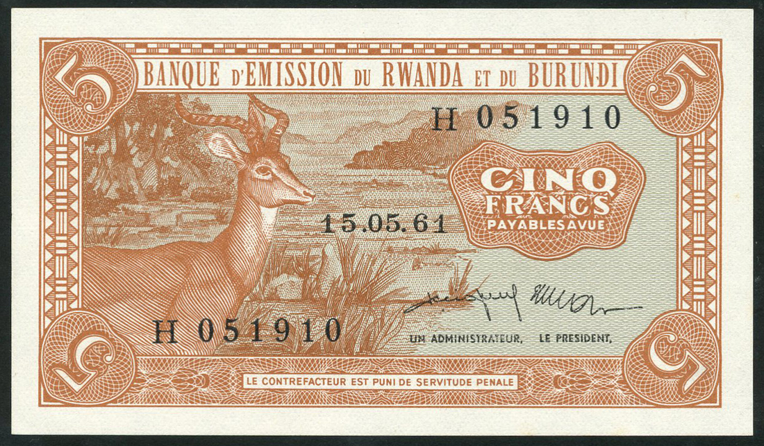 (x) Banque d'Emission du Rwanda et du Burundi, 5 Francs, 15 May 1961, serial number H 051910, light brown on pale green underprint, impala and river bank at left, reverse value set in ornate guilloches and in each corner