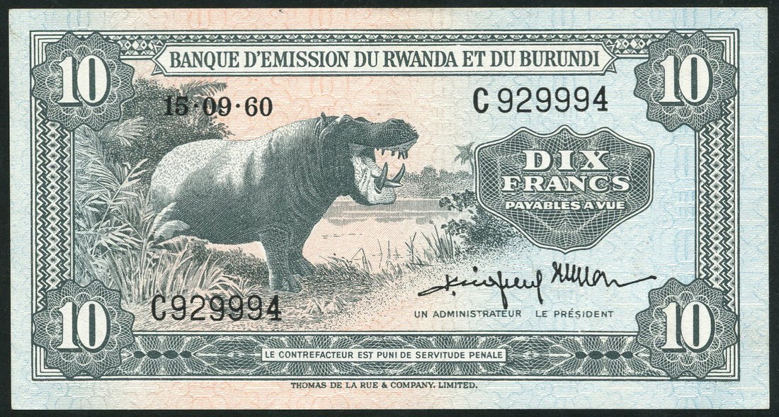 (x) Banque d'Emission du Rwanda et du Burundi, 10 Francs, 15 September 1960, serial number C 929994, grey on pale blue and orange underprint, hippopotamus and river bank at left, reverse value set in ornate guilloches and in each corner