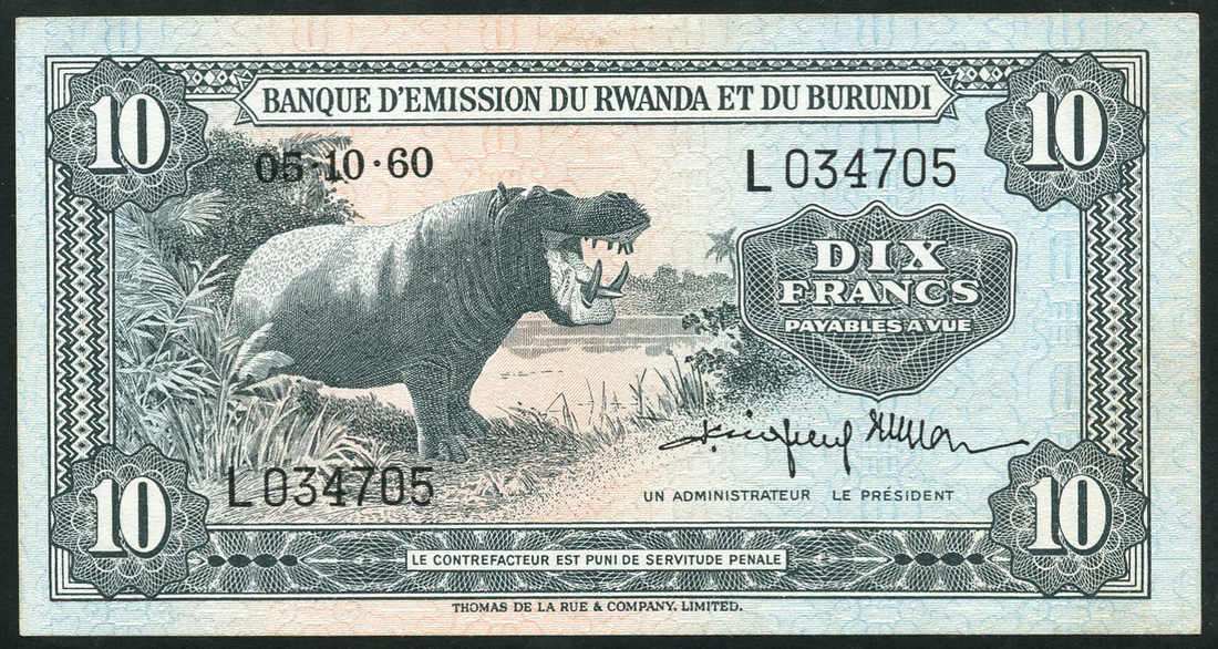 (x) Banque d'Emission du Rwanda et du Burundi, 10 Francs, 5 October 1960, serial number L 034705, grey on pale blue and orange underprint, hippopotamus and river bank at left, reverse value set in ornate guilloches and in each corner
