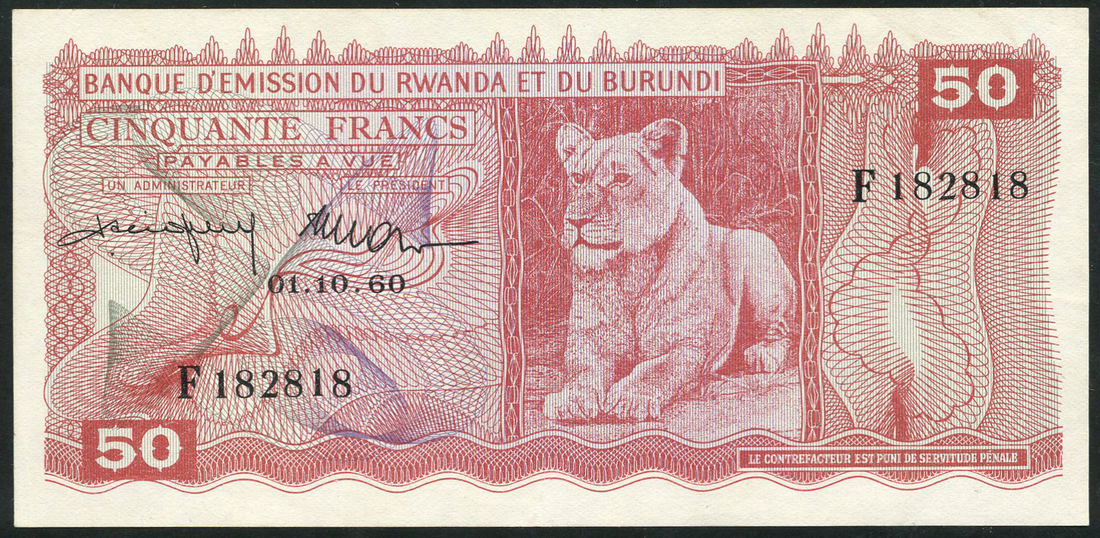 (x) Banque d'Emission du Rwanda et du Burundi, 50 Francs, 1 October 1960, serial number F 182818, red on grey and violet underprint, lioness at centre right, reverse value set in ornate guilloches and in two corners