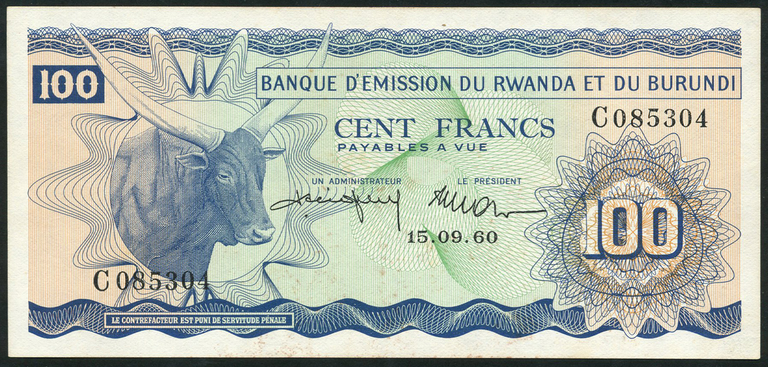 (x) Banque d'Emission du Rwanda et du Burundi, 100 Francs, 15 September 1960, serial number C 085304, blue on green and orange underprint, zebu bull at left, reverse value set in ornate guilloches and in two corners