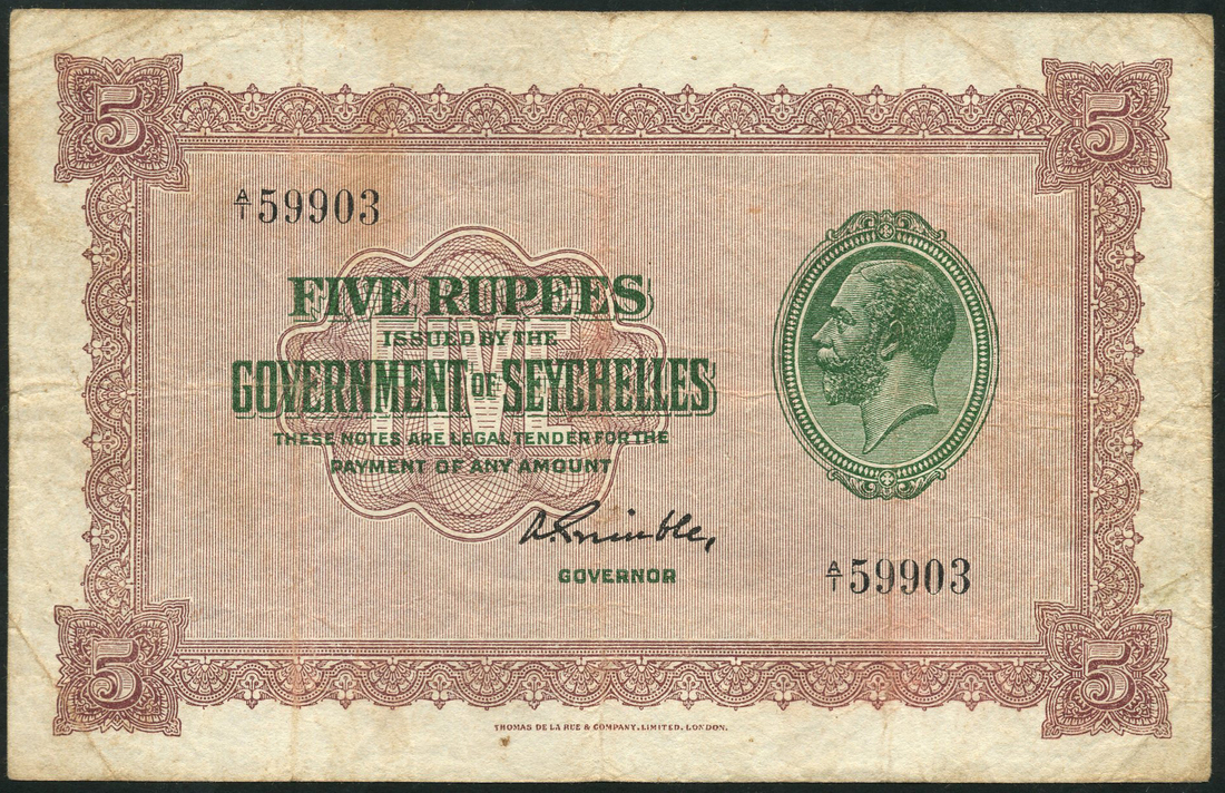 (x) Government of the Seychelles, 5 rupees, ND (1936), serial number A/1 59903, pink, oval vignette of George V in green at right, value in green at left, value at each corner, Arthur Grimble signature low centre, reverse blank