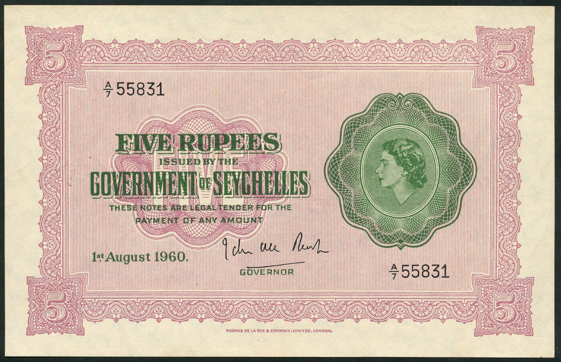 (x) Government of the Seychelles, 5 rupees, 1 August 1960, serial number A/7 55831, lilac, oval vignette of Elizabeth II in green at right, value in green at left, value at each corner, John Thorp signature low centre, reverse blank