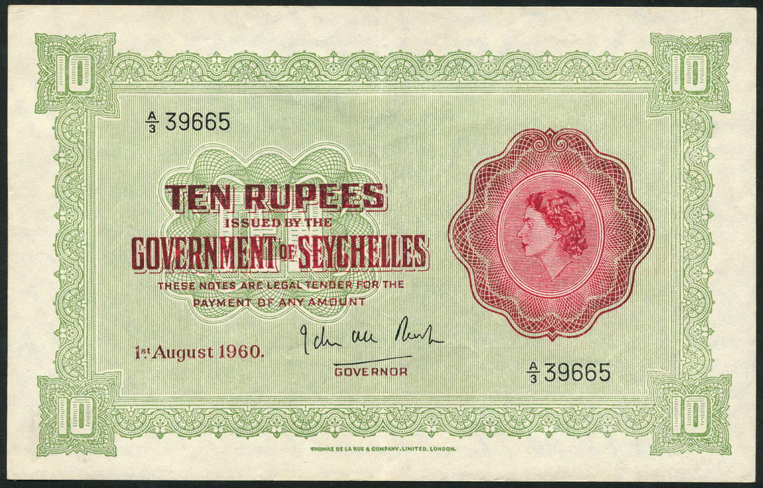 (x) Government of the Seychelles, 10 rupees, 1 August 1960, serial number A/3 39665, lilac, oval vignette of Elizabeth II in red at right, value in red at left, value at each corner, John Thorp signature low centre, reverse blank
