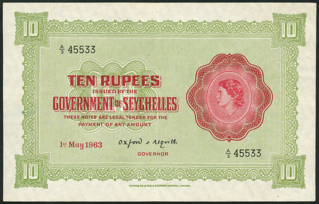 (x) Government of the Seychelles, 10 rupees, 1 May 1963, serial number A/3 45533, lilac, oval vignette of Elizabeth II in red at right, value in red at left, value at each corner, signature of the Earl of Oxford and Asquith low centre, reverse blank