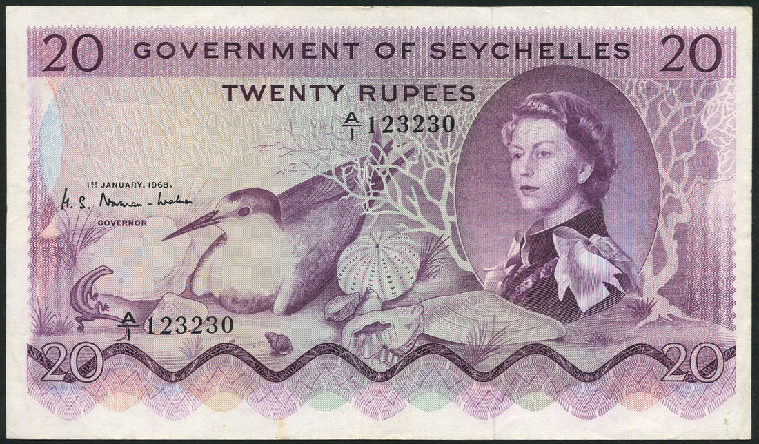(x) Government of the Seychelles, 20 rupees, 1 January 1968, serial number A/1 123230, purple-mauve and pale blue, Elizabeth II at right, Sooty Tern and skink at left, Norman-Walker signature, reverse purple