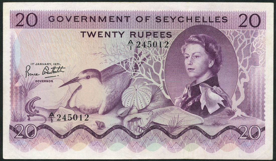 (x) Government of the Seychelles, 20 rupees, 1 January 1971, serial number A/1 245012, purple-mauve and pale blue, Elizabeth II at right, Sooty Tern and skink at left, Bruce Greatbach signature, reverse purple