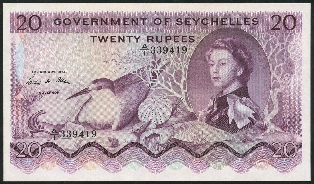 (x) Government of the Seychelles, 20 rupees, 1 January 1974, serial number A/1 339419, purple-mauve and pale blue, Elizabeth II at right, Sooty Tern and skink at left, Colin Allan signature, reverse purple