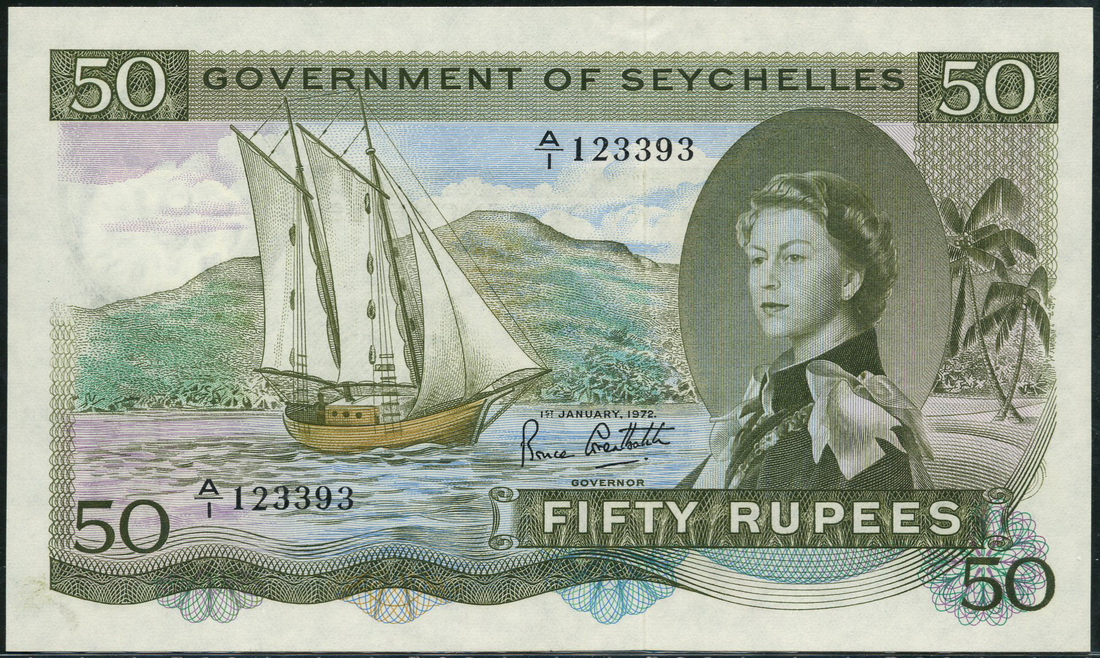 (x) Government of the Seychelles, 50 rupees, 1 January 1972, serial number A/1 123393, green and multicoloured, Elizabeth II at right, sailing boat at left, SEX spelt out in palm trees at right, Bruce Greatbach signature low centre, reverse green, pale pink-red and blue