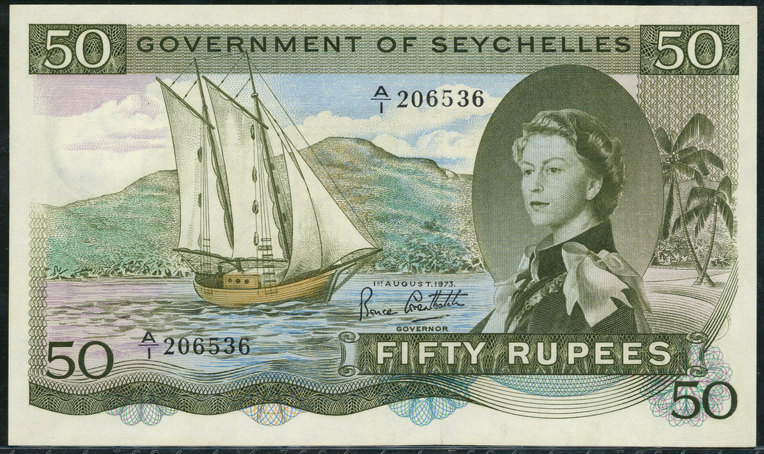 (x) Government of the Seychelles, 50 rupees, 1 August 1973, serial number A/1 206536, green and multicoloured, Elizabeth II at right, sailing boat at left, SEX spelt out in palm trees at right, Bruce Greatbach signature low centre, reverse green, pale pink-red and blue