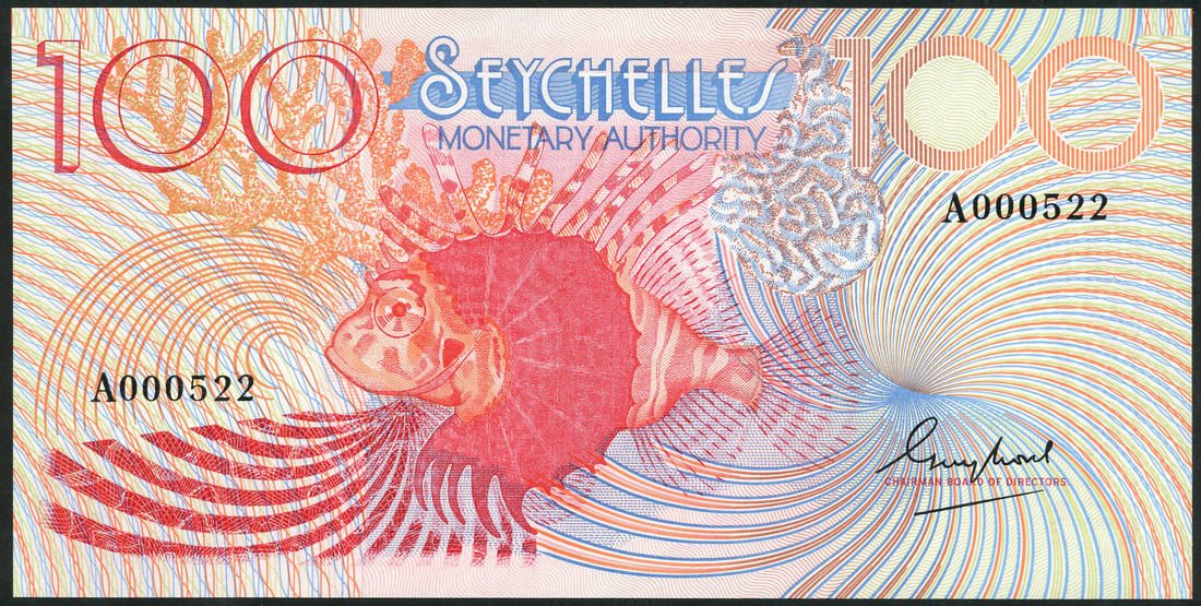 (x) Seychelles Monetary Authority, a set of the ND (1980) series comprising 10 rupees, blue, 25 rupees, yellow and brown, 50 rupees, olive, 100 rupees, red and 100 rupees, pink and light blue, all A prefix, the 100 rupees serial number A 000522, the last 100 rupees prefix B, all Guy Morel signature